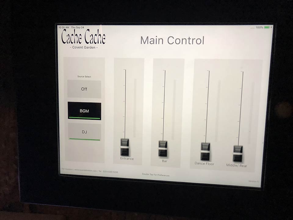 Audio signals, routed via the BSS BLU-100 networked audio processor, are controlled by staff and management via an Apple iPad® with a custom designed control interface. This allows Cache Cache personnel the convenience of walking into each zone and adjusting sound levels as required.