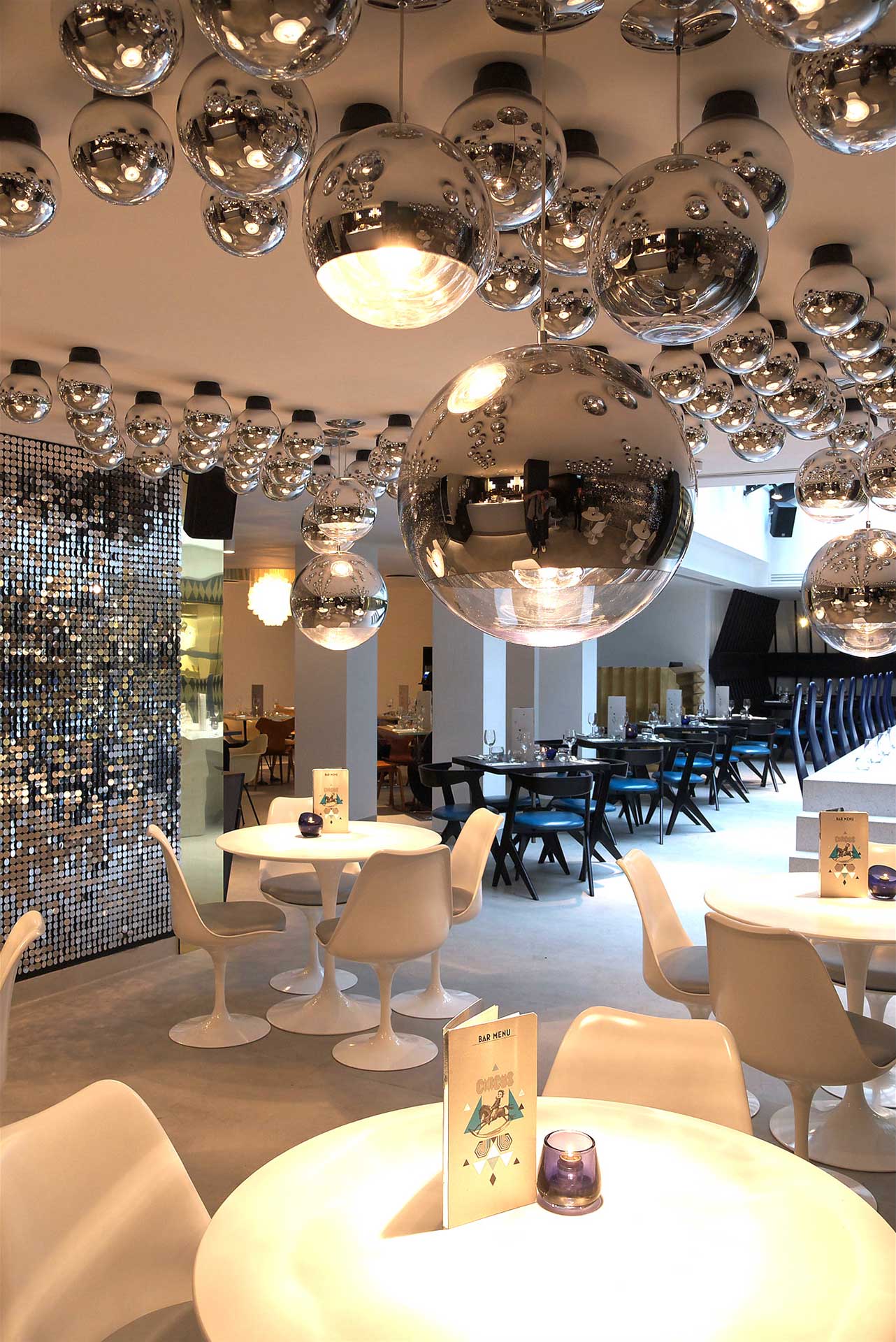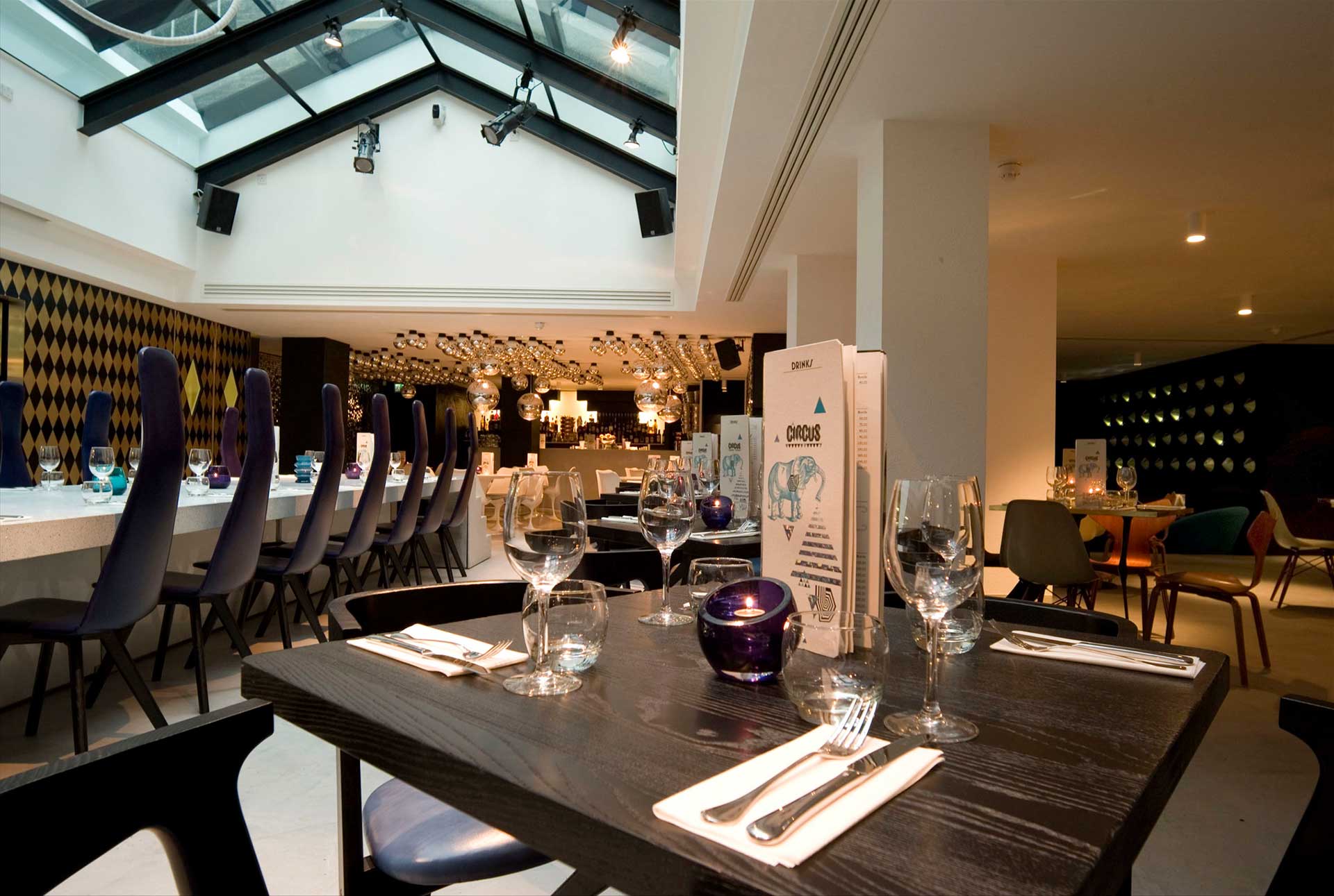 Knowing that Adam Davies wanted a highly theatrical environment, Sound Division specified DMX lines and additional power feeds to accommodate seven ETC Source 4 Junior profiles and four Martin smart MAC moving heads, projecting powerful gobos and graphics onto the pelmet under the glazed conservatory roof, and scattering beams off two rotating 16” mirrorballs.