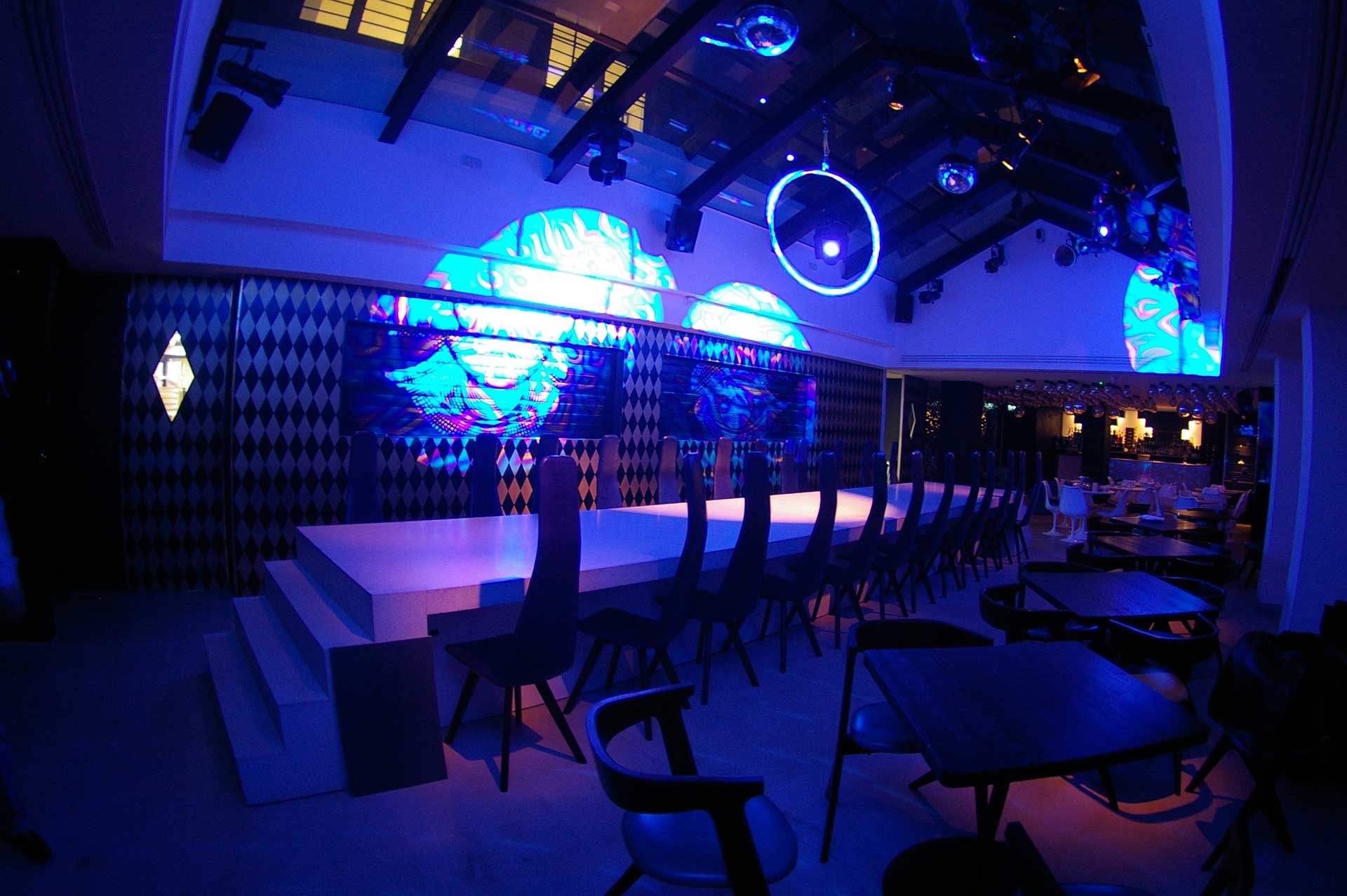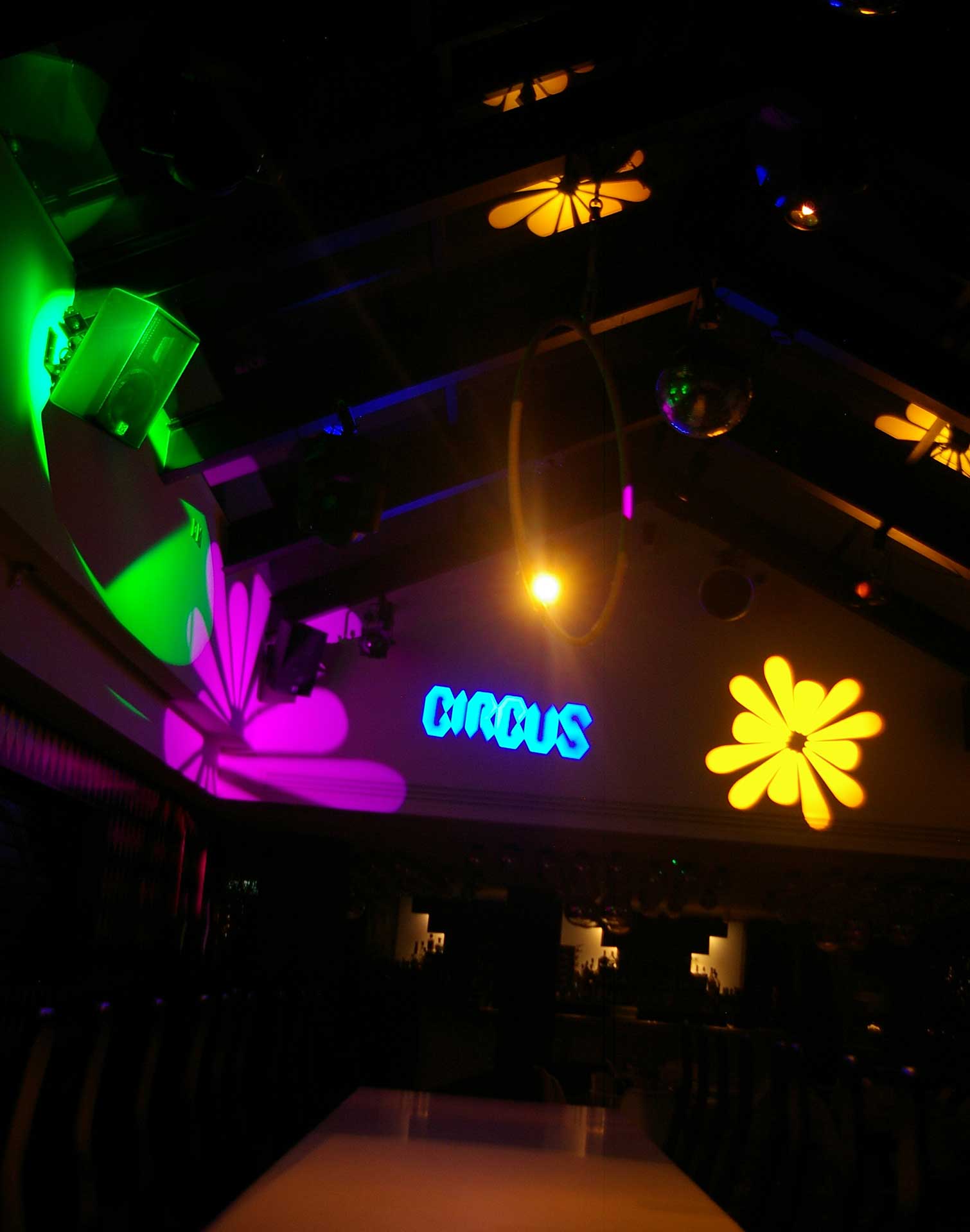 Two powerful 400W UV cannons have been installed, one either side of the stage, with the purpose of illuminating the trapeze artists/performers. Within the lounge, there is a second smaller stage podium with a dancing pole, where performers are illuminated with PAR 16 Birdies and a Minuette Fresnel.